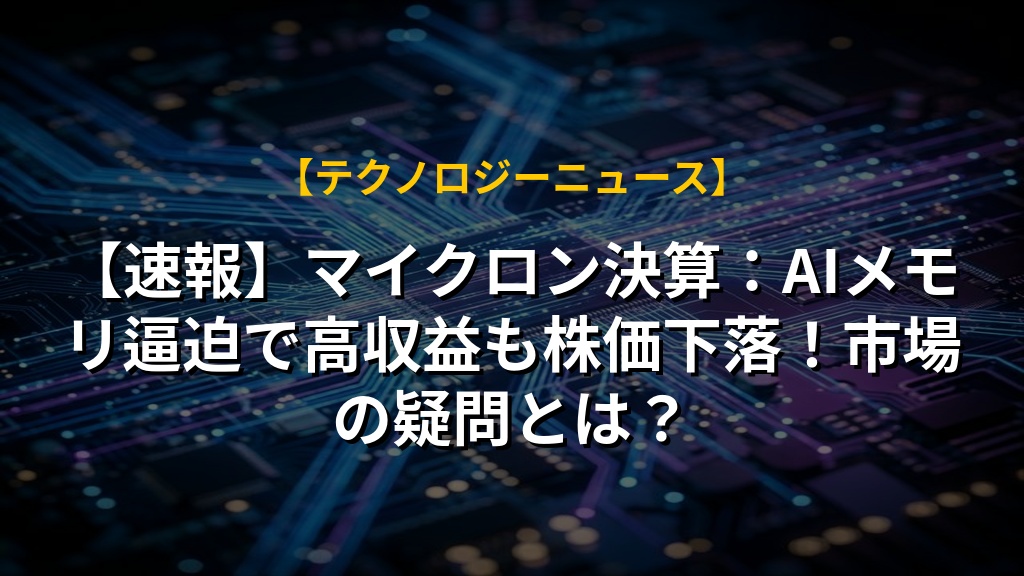 マイクロン・テクノロジーがAI需要を背景に好決算を発表しましたが、株価は下落。市場は好調の持続性に疑問を抱いているようです。メモリ供給が逼迫している状況が追い風ですが、高収益がいつまで続くのかが焦点となります。