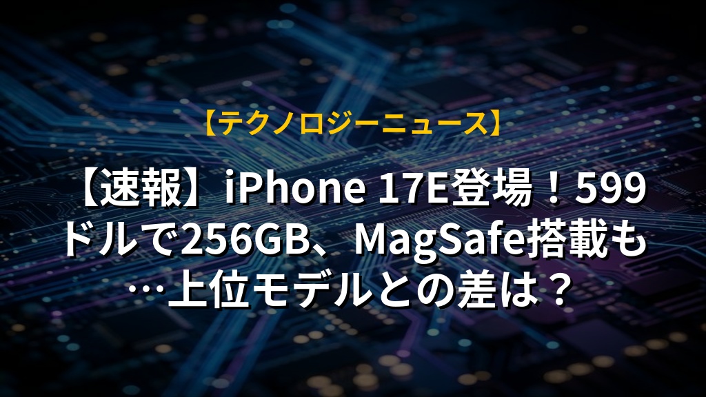 - 新型iPhone 17Eは、エントリーモデルとして599ドルで提供され、前モデルよりストレージが256GBに増量、MagSafeにも対応。