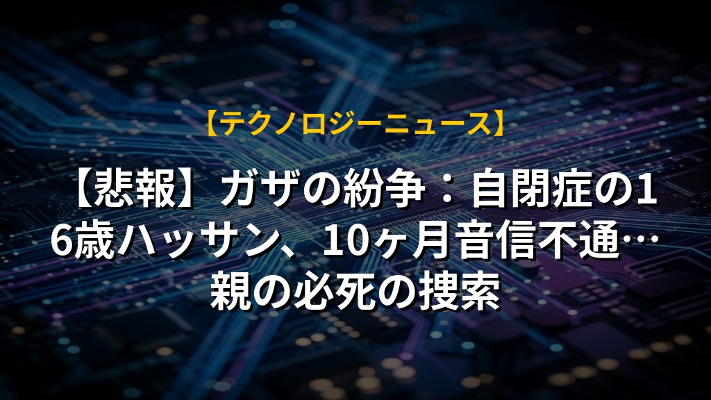 ガザ地区で、16歳の自閉症の息子ハッサン君を探し続けるご両親の姿が胸を締め付けます。10ヶ月間連絡が途絶え、解放される人々の情報に縋る日々。安定を求めるハッサン君にとって、紛争は日常を奪い、心身に大きな負担をかけています。食料不足の中、母親に怒りをぶつける場面は、言葉にできない苦しさを物語っているように感じます。この報道は、紛争が個人の尊厳を踏みにじり、特に弱い立場にある人々に深刻な影響を与えることを改めて教えてくれます。一日も早く、ハッサン君と家族が再会できることを心から願っています。