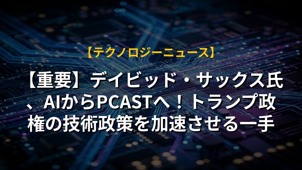 ベンチャーキャピタリストのデイビッド・サックス氏が、トランプ政権でAI・暗号資産担当から、大統領科学技術諮問委員会(PCAST)の共同議長に就任しました。AIだけでなく、幅広い技術分野への提言を通じて、政府の技術政策に大きな影響を与えることが期待されます。インフラ整備やエネルギー政策の加速にも貢献する見込みで、今後のアメリカの技術競争力向上に注目です。技術革新と規制のバランスをどう取るかが課題となりますが、引き続きサックス氏の動向から目が離せません。
