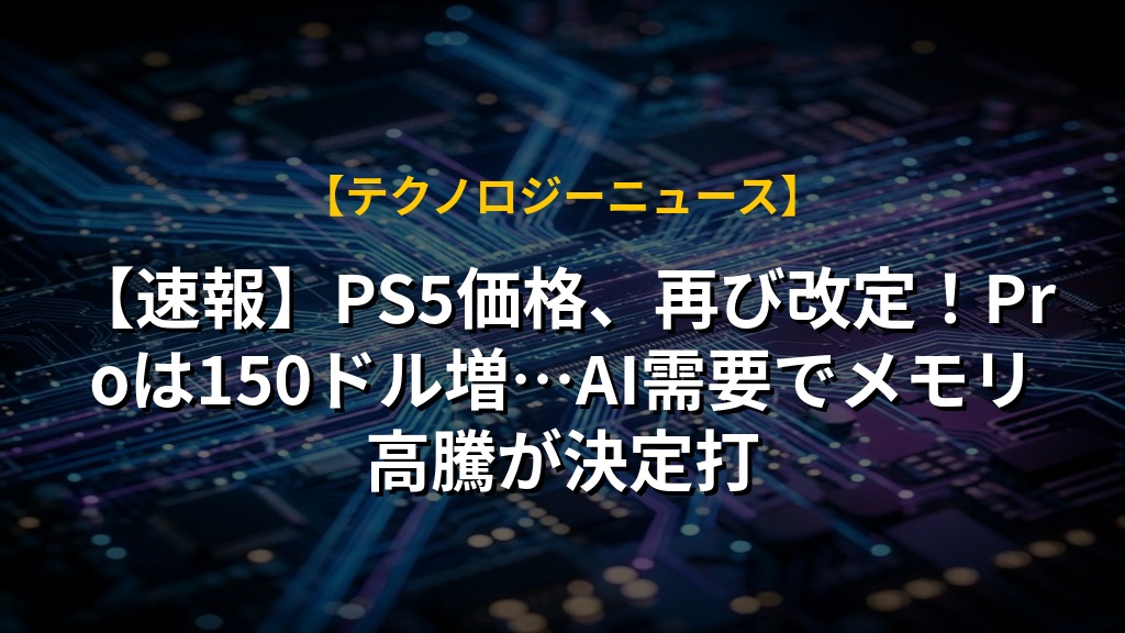 PS5の価格が、なんと再びの値上げとなりました。世界経済の状況や、特にAI需要の高まりによるメモリ価格の急騰が理由とのことです。ゲーム体験を維持するためとはいえ、お財布には厳しいニュースですよね。高性能版PS5 Proの値上げ幅が大きいのも気になります。ゲーム機メーカーも、ハードウェアの利益を確保せざるを得ない時代になったのかもしれません。今後のゲーム業界の動きにも注目していきたいです。