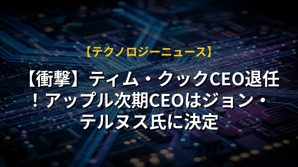 【衝撃】アップルCEOティム・クック氏退任!後任はテルナス氏、4兆ドル帝国はどうなる?アップルCEO交代のニュース概要 アップルは、2011年からCEOを務めてきたティム・クック氏がCEOを退任すると発表しました。 後任に...