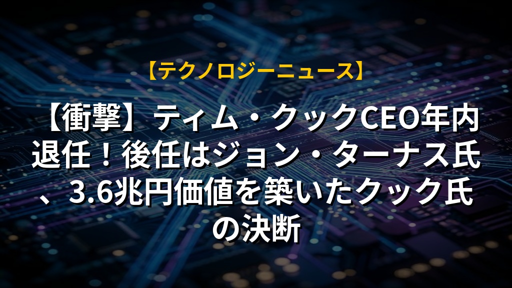 【衝撃】ティム・クックCEO年内退任!後任はジョン・ターナス氏、3.6兆円価値を築いたクック氏の決断