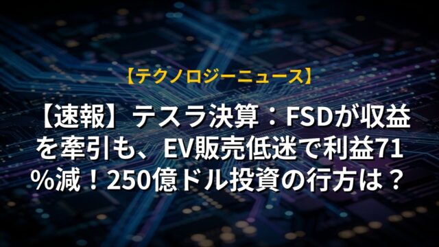 【速報】テスラ決算:FSDが収益を牽引も、EV販売低迷で利益71%減!250億ドル投資の行方は?